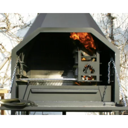 Ce barbecue en tôle d’acier de 3 à 5 mm d’épaisseur est surmonté d’une hotte en double paroi qui permet aux côtés extérieurs de rester tiède pour plus de sécurité.