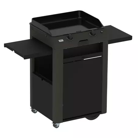Ensuite, le chariot possède plusieurs espaces de stockage : il est possible de ranger la bouteille de gaz sous la plancha, 2 tablettes latérales permettent de déposer des produits, porte épices en façade.